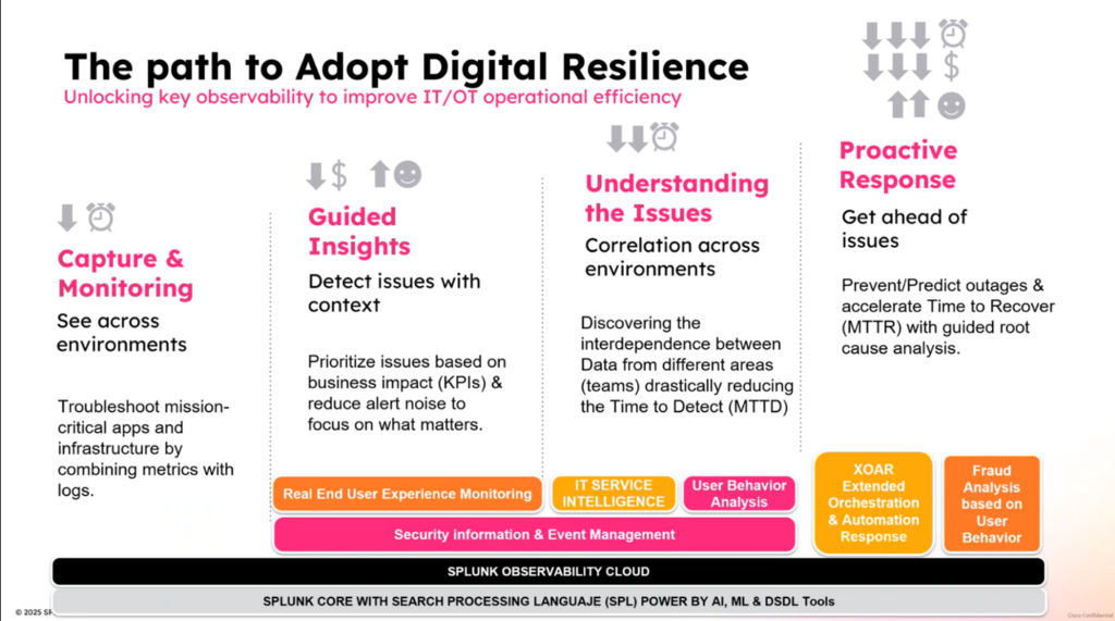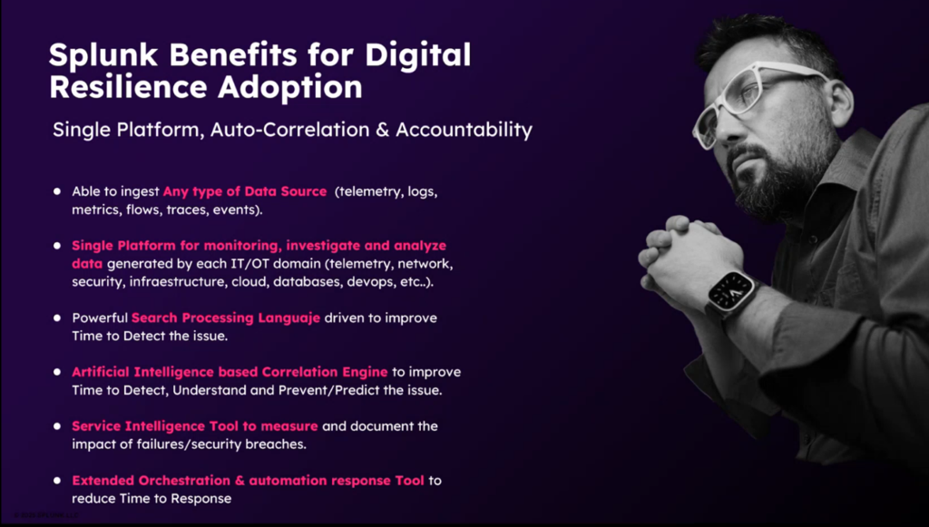 Splunk aborda este problema reduciendo la cantidad de alertas, correlando eventos y entregando una única visión contextual, lo que permite respuestas más rápidas, coordinadas y efectivas.