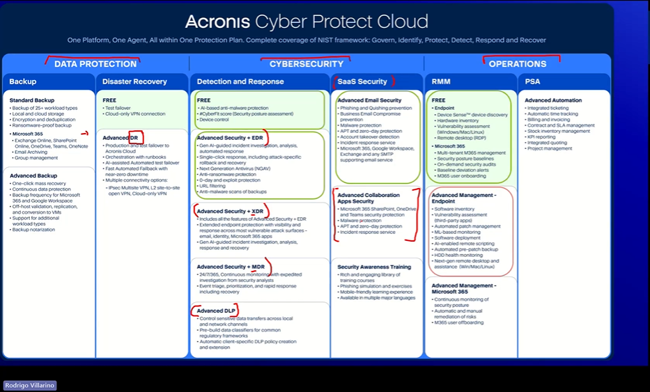 no solo hace backup, sino que combina protección de datos, antimalware, EDR, recuperación rápida, forensics, protección contra ransomware y respuesta ante incidentes, todo en una sola plataforma.